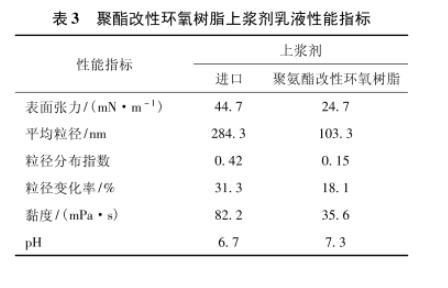 所制备的聚酯改性环氧树脂上浆剂在核磁共振谱图的1.6×10-6、3.8×10-6、4.8×10-6、6.8×10-6、7.2×10-6处,红外光谱在3 309 cm-1、2 971/2 870cm-1、1 600 cm-1、1 721 cm-1以及1 103 cm-1等处出现甲基、苯环、聚酯、聚醚的特征吸收峰,表明结构中存在聚酯多元醇、双酚A聚醚阴离子表面活性剂等组分。双酚A聚醚阴离子表面活性剂具有优异的乳化性能和极低的浸润性能,在和聚酯多元醇配合的情况下,可显著降低上浆剂乳液的表面张力,提高上浆效率,增强上浆均匀性和稳定性。