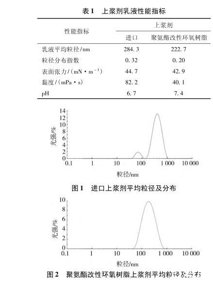 与进口上浆剂相比,制备的上浆剂乳液粒径稳定,变化率小,可稳定保存;黏度低,不易沾辊絮化;pH呈中性。