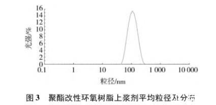 制备的聚酯改性环氧树脂上浆剂乳液性能见表3,粒径及分布测试结果见图3。