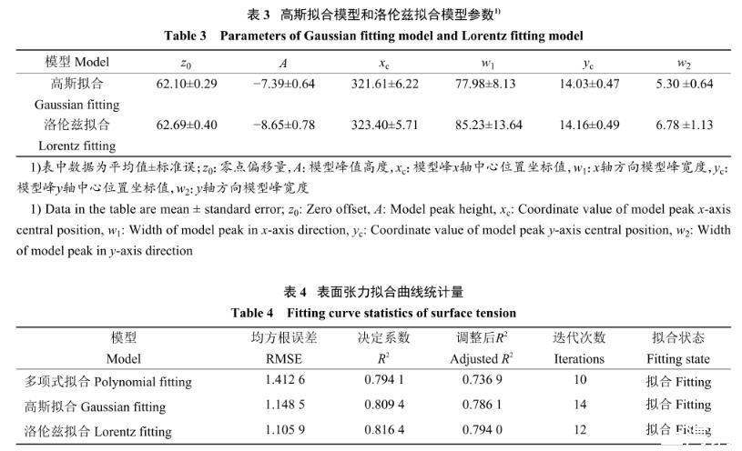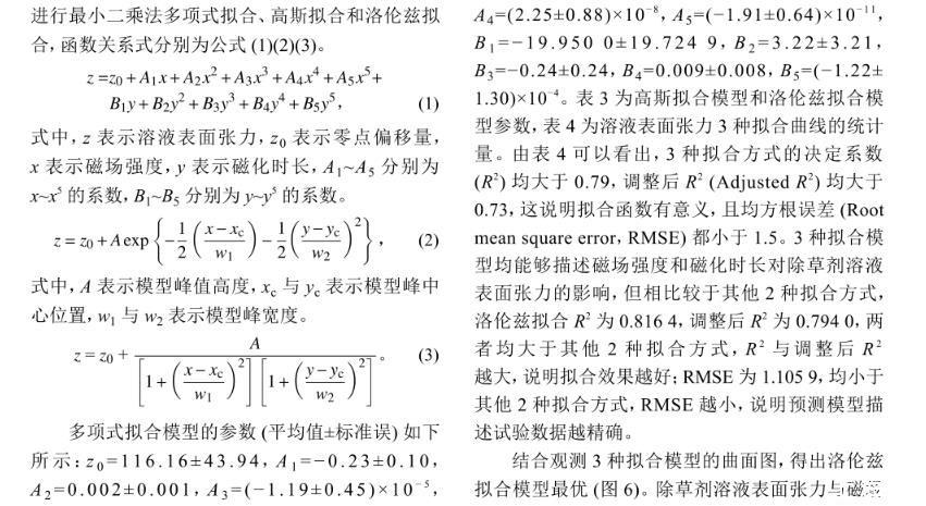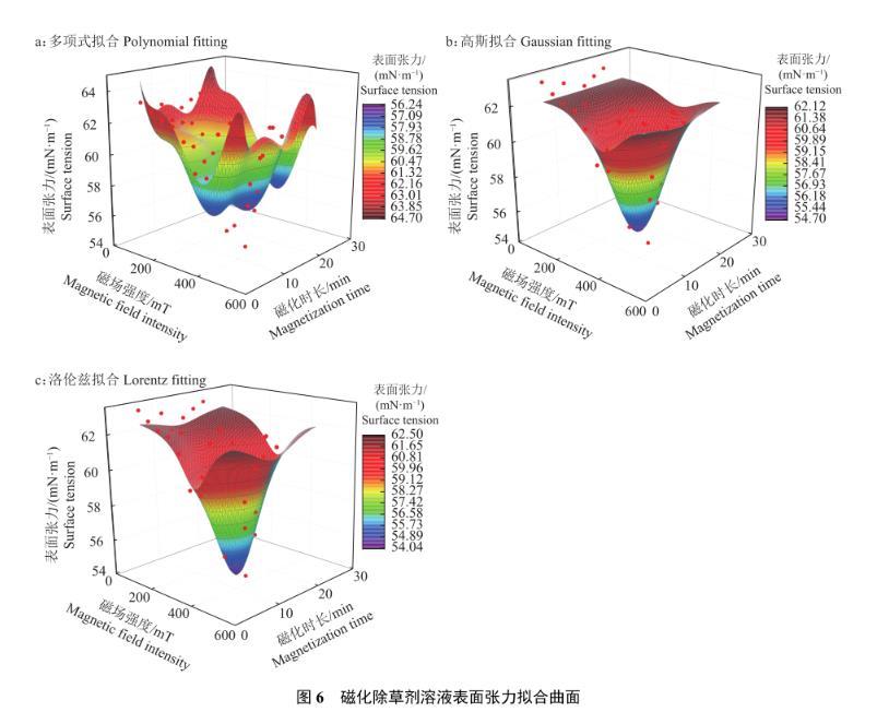结合观测3种拟合模型的曲面图,得出洛伦兹拟合模型最优(图6)。除草剂溶液表面张力与磁场强度和磁化时长的关系式见公式(4),为研究磁化作用对除草剂溶液表面张力的影响提供理论参考。
