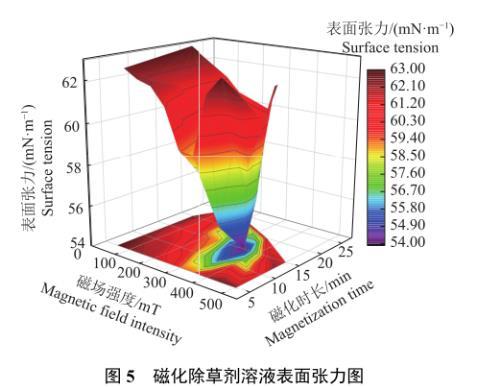 为了直观地分析磁场强度和磁化时长2个因素共同作用对除草剂溶液表面张力的影响规律,建立以磁场强度和磁化时长为自变量、以溶液表面张力为因变量的二元函数,使用OriginPro 2018绘制磁场强度和磁化时长对表面张力影响规律的空间曲面分布图(图5)。由图5可以看出,磁场强度和磁化时长对溶液表面张力影响规律的空间曲面分布图呈峰值为负值的高斯空间分布规律,即空心圆锥面分布,这说明并不是磁场强度越大或者磁化时间越长,除草剂溶液的表面张力就越小,而是存在处理效果最佳的磁场强度和磁化时长。磁化除草剂溶液表面张力试验结果见表2。当磁场强度为350 mT、磁化时长为15.0 min时,除草剂溶液表面张力值最小,为54.0 mN/m,下降14.96%,磁化效果最佳。