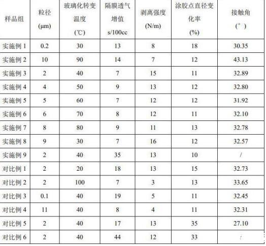 测试结果表明,当胶液稀释液表面张力在28mN/m以上时,隔膜粘接剂组合物涂布并干燥后的胶点直径变化率较小,当表面张力太低时,胶点直径变化率较大,透气增值变大。当聚合物颗粒A粒径在0.2-10μm,玻璃化转变温度在30-90℃范围内时,隔膜同时具有较低的透气增值以及更好的剥离强度。聚合物颗粒A粒径太小时,容易堵塞隔膜孔道造成透气增值增大,并且剥离强度也较弱。聚合物颗粒A粒径太大,聚合物颗粒A涂布后容易脱落,剥离强度降低。聚合物颗粒A玻璃化温度太高,热压时无法软化,剥离强度低;而玻璃化温度太低则容易成膜,造成隔膜透气增值变大。