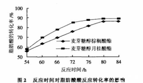 由图2可见,随着反应时间的延长,脂肪酸的转化率显著提高,反应时间80h达到最大值。