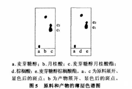 图5为展开剂展开后的薄层色谱图。麦芽糖醇月桂酸酯的质谱鉴定:麦芽糖醇(单)月桂酸酯和麦芽糖醇双月桂酸酯的相对分子质量分别为526.3和708.3,质谱图中出现549.4峰和731.3峰分别为[M单酯+Na]和[M双酯+Na]的质谱信号,说明薄层色谱图5中的c1和c2分别为麦芽糖醇单月桂酸酯和麦芽糖醇双月桂酸酯。