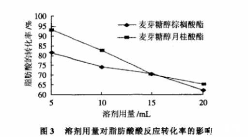 由图3可以看出,随着溶剂的用量减少,反应转化率有明显提高。说明溶剂用量对反应影响较大,这是因为溶剂用量减少,可以使脂肪酶的浓度增加,有利于反应的进行。但是,进一步减少溶剂的用量会使反应在比较黏稠的状态下进行,而且不利于脂肪酶(固体颗粒状)的催化反应效果。故在本实验中选择溶剂的用量为5mL,此时反应混合物处于良好的流动状态,脂肪酶的催化效率高,脂肪酸的反应转化率也较高。