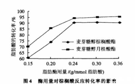 由图4可见,在本实验条件下,当酶的用量增加时,脂肪酸的反应转化率增加。当酶的用量为0.24g/mmol脂肪酸时,催化效果最好,棕榈酸及月桂酸的反应转化率分别为达到90.6%和94.3%。