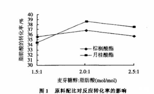由图1可知,在原料配比麦芽糖醇:脂肪酸酸分别使用1.5:1、2:1、2.5:1进行反应时,麦芽糖醇:脂肪酸为2:1时,脂肪酸的反应转化率是最好的,但是,结果相差不大。即在本实验条件下原料配比对反应的影响较小。分析原因,是因为麦芽糖醇和脂肪酸为互不相溶体系,在反应中,用丙酮做溶剂,即使能建立一个均相的反应体系,由于麦芽糖醇在丙酮中的溶解度比较小,溶液中随麦芽糖醇的量增加而改变不大。而当麦芽糖醇达到一定用量后,会破坏原有的平衡,导致脂肪酸反应的转化率降低。所以,反应中选择麦芽糖醇:脂肪酸的配比为2:1为反应的最佳配比。