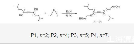 4种表面活性剂的合成条件相同,以P1的合成为例。首先将450 g(1.77 mol)2,5,8,11-四甲基~6-十二炔~5,8-二醇加入到高压反应釜中,用高纯氮气置换釜内气体3次;随后加入3.65 g(0.036 mol)三乙胺,升温至75℃后匀速通入316 g(7.18 mol)环氧乙烷,并持续反应3.5 h;反应完成后,将反应釜冷却至室温,打开反应釜阀门将残余的环氧乙烷排放至尾气吸收装置,收集粗产物;通过旋转蒸发仪除去粗产物中的三乙胺,得到739 g淡黄色液体,产率为96.5%.P2,P3和P4的合成步骤与表征见本文支持信息图S1——S4.