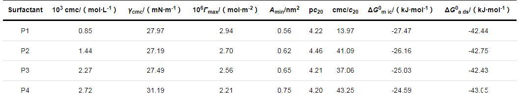 利用ΔG0a ds和ΔG0m ic表征表面活性剂的热力学性质。P1,P2,P3和P4的ΔG0a ds和ΔG0m ic均小于0,说明表面活性剂在气/液界面层上的吸附行为以及在水溶液中形成胶束的行为是自发进行的。4种表面活性剂的ΔG0a ds均小于ΔG0m ic,表明表面活性剂分子在溶液中会先形成吸附层,当气/液界面吸附达到饱和状态后才开始在溶液内部形成胶束聚集体。