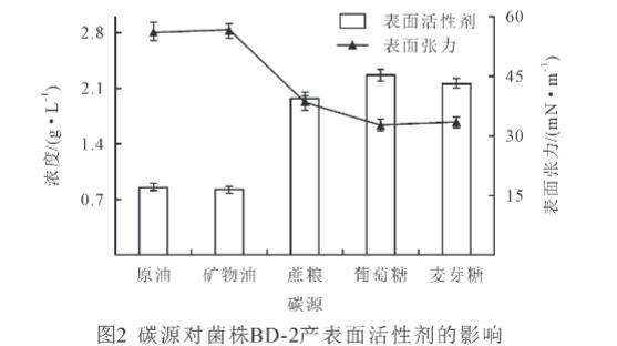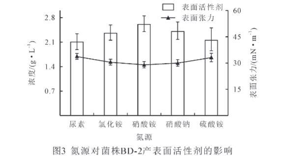 碳源对微生物的生长和次生代谢产物的产生有重要的影响。由图2可知,不同碳源对菌株BD-2产表面活性剂量的影响不同,本实验将原油、矿物油作为一类复杂碳源,葡萄糖、麦芽糖、蔗糖作为简单碳源,进行对比分析发现,以简单碳源作为底物时,菌株BD-2产表面活性剂的量显著高于复杂碳源(P<0.05),其产表面活性剂量大小依次为葡萄糖>麦芽糖>蔗糖>原油>矿物油。同时以简单碳源为底物时,菌株BD-2能显著降低发酵液表面张力(P<0.05),其发酵液表面张力大小依次为原油>矿物油>蔗糖>麦芽糖>葡萄糖。在简单碳源中,以葡萄糖为碳源时,菌株BD-2产生的表面活性剂的量最高,为2.26 g/L,而表面张力最低,为32.7 mN/m。研究结果表明,简单碳源有利于菌株BD-2产表面活性剂。因此,选择葡萄糖为菌株BD-2的碳源。
