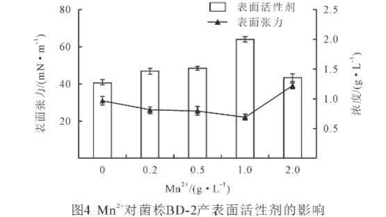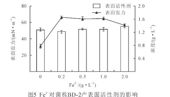 由图5可知,当Fe2+浓度为0.2 g/L时,表面张力最大,可达66.4 mN/m,而表面活性剂量为1.22 g/L,当Fe2+浓度是CK时,表面张力最小,为30.9 mN/m,此时的表面活性剂量为1.27 g/L,而当Fe2+浓度为2 g/L时,表面活性剂量最大,为1.37 g/L,此时的表面张力为56.6 mN/m。分析可得,增加Fe2+后,菌株的表面张力明显增加,表面活性剂量无显著变化(P>0.05),Fe2+对菌株BD-2产表面活性剂无促进作用。