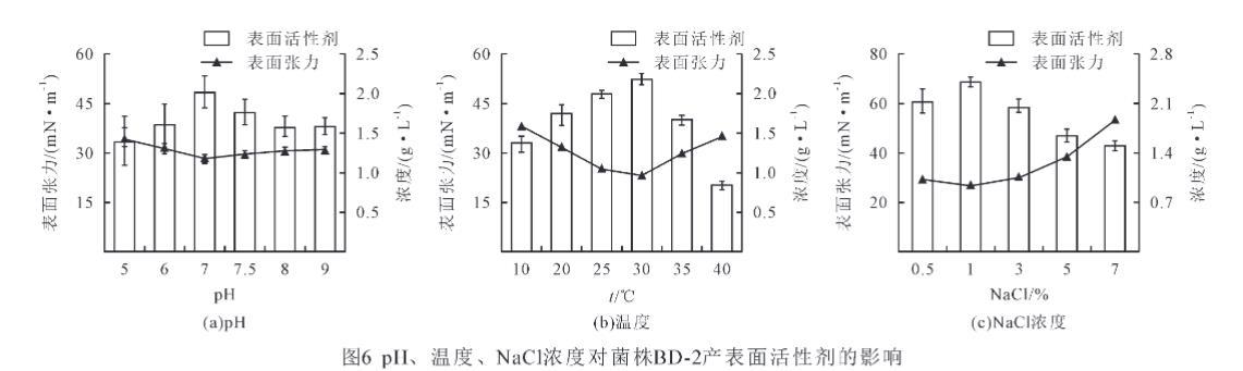 对菌株BD-2在不同的环境条件下进行了发酵实验。如图6(a)所示,pH在5~7之间,生物表面活性剂量明显增加,在pH为7时,表面活性剂量最高,为1.64 g/L,而发酵液表面张力由34.3 N/m下降到28.2 mN/m。pH大于7后生物表面活性剂量显著下降(P<0.05),表面活性剂量由2.01 g/L下降到1.57 g/L。pH为7后表面张力显著上升(P<0.05),表面张力由28.2 mN/m升高到31.1 mN/m。研究结果表明,菌株BD-2在pH为7时生物表面活性剂量最多、表面张力最低,因此,菌株BD-2的最适发酵pH为7。