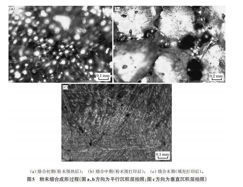 图5粉末熔合成形过程(图a、b方向为平行沉积层拍照;图c方向为垂直沉积层拍照)