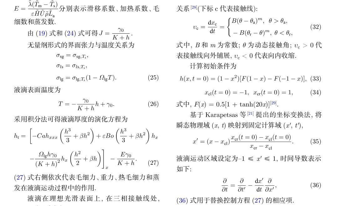 接触线处的液滴高度为零,即h(x=xcl=xcr,t)=0,其中xcl和xcr分别代表左侧和右侧接触线位置.采用下式描述接触线移动速率与接触角间的关系[28](下标c代表接触线):