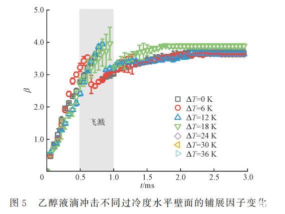 为了探究水平壁面过冷度对液滴冲击的影响机制,定义无量纲铺展因子β=D(t)/D0,其中D(t)为液滴每一时刻的直径,Dmax为液滴能达到的最大铺展直径,对应的最大铺展因子为βmax=Dmax/D0。图5展示了不同水平壁面过冷度下,乙醇液滴冲击水平壁面的铺展因子β随时间的变化曲线。可以看出,乙醇液滴冲击不同过冷度水平壁面均在1.0ms内发生破碎-飞溅,在这段时间内,铺展速率近似为线性,在飞溅后,β突然减小,随后铺展因子继续增,铺展速率逐渐减小,最终趋于0,液滴形态不再发生变化。