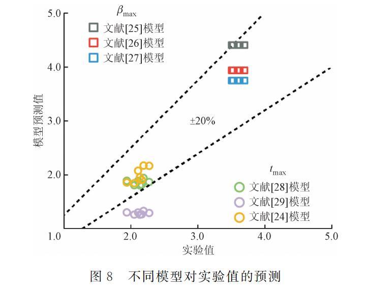 式中:tmax,pre和βmax,pre为使用各模型的最大铺展时间和最大铺展因子预测值;tmax,exp和βmax,exp为最大铺展时间和最大铺展因子实验值。如图8所示,不同公式的预测结果不同,对于最大铺展因子,尽管不同学者提出的表达式对实验结果的预测准确率均较好,单个数据点的偏差均在20%以内,然而由于表达式的限制,无法针对液滴冲击不同水平壁面过冷度的实验工况进行预测,存在一定缺陷。对于最大铺展时间,Huang和Chen等人提出的表达式预测效果较差,Wildeman等提出的表达式预测效果较好,相对平均偏差为12.32%,但由于其表达式内不包含水平壁面过冷度的影响因素,因而预测效果略差于Shang等提出的表达式,其相对平均偏差为6.05%。综上所述,现有最大铺展时间的表达式能较好预测乙醇液滴冲击过冷水平壁面的铺展动力学行为,但最大铺展因子表达式仍需进一步探索。
