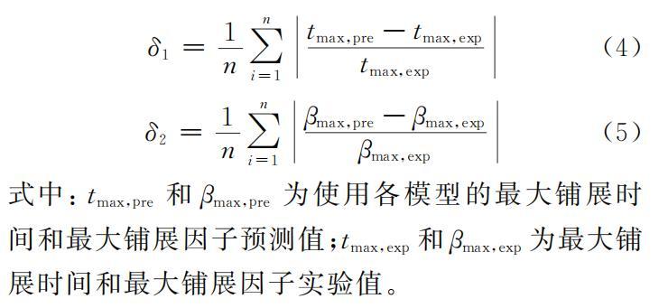 利用表1中的模型,对乙醇液滴冲击过冷水平壁面的最大铺展时间和最大铺展因子进行预测,并采用相对平均偏差δ为评价指标,衡量不同公式的预测效果
