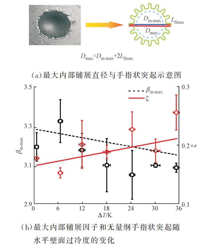为了揭示βmax随水平壁面过冷度的这一非单调变化,将βmax分为两部分,并分别研究各部分与乙醇浓度的关系。如图7(a)所示,βmax包含内部铺展无量纲直径βin-max=Din-max/D0,以及边缘的无量纲指状长度ζ=LfmaxD0,其中Din-max为液滴铺展到最大程度的内部铺展直径,Lfmax为液滴铺展至最大的指状长度。当ζ<0.15时,认为液滴不形成指状突起,当ζ≥0.15时,认为液滴形成指状突起。
