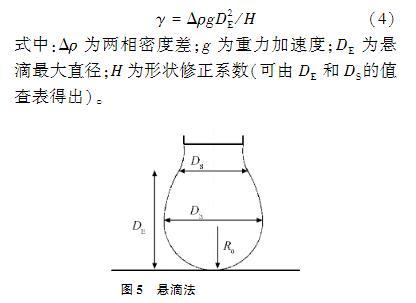 Jyoti等使用轴对称液滴形状分析法(axisymmetricdropshapeanalysis,ADSA)研究单层压缩速率对表面张力⁃表面积等温线形状的影响。悬滴法(见图5)可认为是ADSA的雏形,其通过Laplace方程应用于液滴轮廓来确定悬垂液滴的表面张力和接触角,悬滴法实质上是滴外形法的一种。滴外形法的基本原理是:当液滴在管口形成时,液滴形状与表面张力存在一定的关系。悬滴法测量表面张力可由下列公式计算:γ=ΔρgD2E/H(4)式中:Δρ为两相密度差;g为重力加速度;DE为悬滴最大直径;H为形状修正系数(可由DE和DS的值查表得出)。