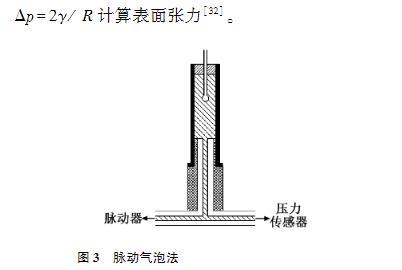 脉动气泡法表面张力计已被广泛用于天然表面活性剂或肺表面活性剂相关的化合物的研究。其可以通过设定脉动率与呼吸率相同,从而模拟呼吸动力学。测试时间较短,一般在5min内。但它也存在一些缺点,当待测液表面分子最大程度的压缩在一起时,气泡不再保持球形,故基于球形气泡的假设来计算表面张力会带来较大的误差。另外,与Langmuir⁃Wilhelmy天平法一样,膜表面泄漏的问题仍然存在。