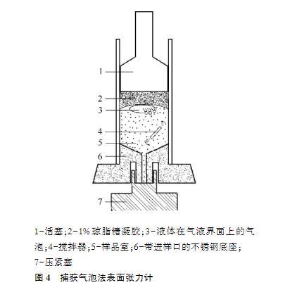 为了避免膜泄漏的出现,Schürch等引入了一种防泄漏的捕获气泡法表面张力计。在捕获气泡法装置中(见图4),待测液体充满样品室,样品室顶部镀有一亲水性琼脂糖凝胶,从底部进样口引入的气泡在浮力作用下上升并紧靠琼脂糖凝胶层,同时气泡和凝胶层之间由于液体样品薄层的阻隔,故不会黏附于凝胶层之上。气泡的体积通过改变样品室中的压力来控制。随着气泡体积减小,表面积减小,气泡表面张力下降。气泡形状随表面张力的变化而变化,从球形到椭圆形。对于初始直径大于5mm气泡,当表面张力趋于0时,气泡呈薄圆盘状。测量时,通过推动活塞改变样品室的压力来控制气泡体积,并用视频记录气泡体积变化。最后从视频图像中测得气泡的高度和直径,利用Malcolm等提出的方法计算气液界面的表面张力、气泡体积和表面积。