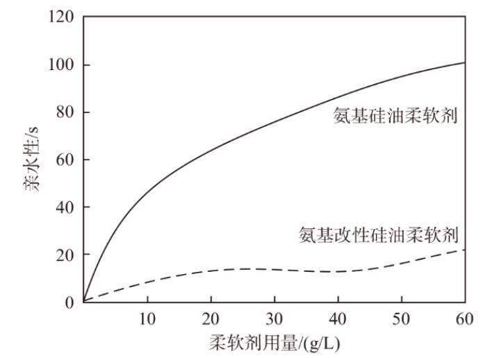 4)当用量为20 g/L时,氨基改性硅油柔软剂亲水性为10.4 s;当用量为50 g/L时,氨基改性硅油柔软剂亲水性小于20 s,与氨基硅油柔软剂相比,氨基改性硅油柔软剂在亲水性方面有所改善。