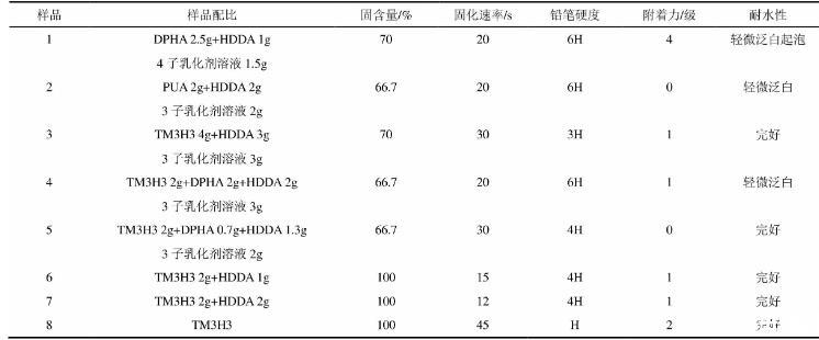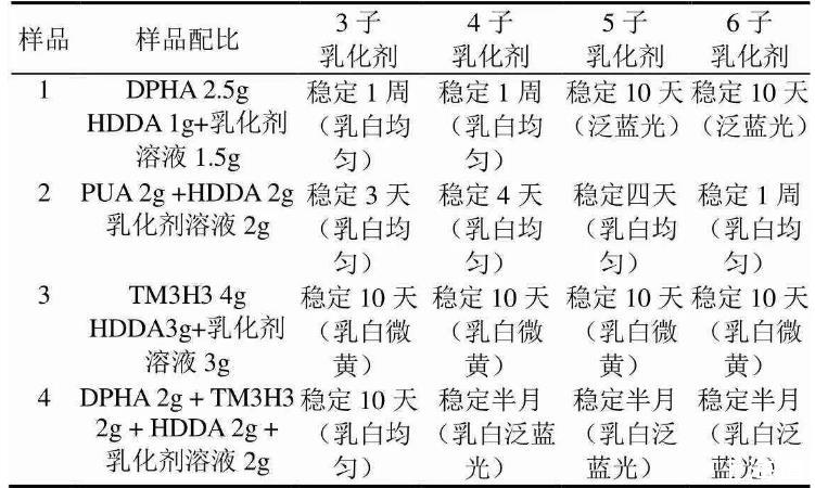 注:所用乳化剂溶液浓度均为0.06mol/L的钠盐溶液,以4%的1173引发光固化。