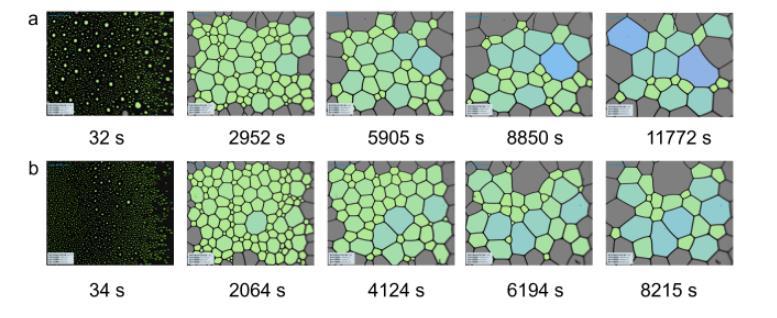 图5(a)1 g/L C72-MPB和(b)2 g/L C72-MPB表面活性剂溶液从泡沫峰值高度后的不同时间的泡沫形态