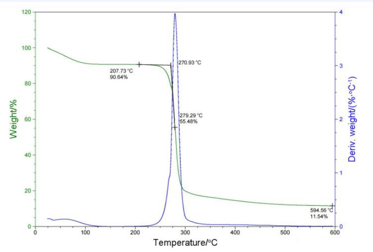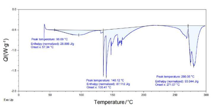 TGA图中可以看到样品的失重主要集中在100℃以下和250℃到300℃,DSC图中可以看出样品的吸热主要有三个区域,分别在100℃以下,140——170℃和260——300℃。结合TGA和DCS来看,在温度100℃以下部分是少量溶剂及产物中的水蒸发,温度达到140℃时,DSC中有吸热峰,但TGA曲线没有变化,说明产物发生相变,从固体转变为液体,直到250℃左右开始失重,最终仍有11.54%固体剩余证明一定存在分解现象并产生固体产物,结合DSC图中有多个吸热峰来看推测是产物有多步分解,也不排除存在部分的汽化失重的可能性。