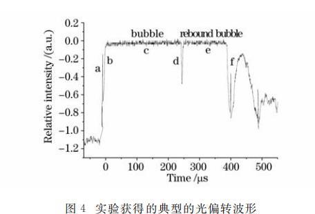 图3给出了探测光经过脉动空泡的示意图,图中空泡脉动特性曲线是基于空泡半径随时间变化的数值模拟得到的。图4即为由探测装置图2(a)获得的对应的典型光偏转信号波形图,它包含了激光作用于水中靶材时的三种物理现象和过程,即激光等离子体冲击波、等离子体空泡及其反弹现象、空泡溃灭冲击波。图中峰a为激光等离子体冲击波;c为等离子体空泡信号;e为空泡反弹信号;f为空泡收缩到最小泡体积时辐射的冲击波信号;b为空泡膨胀壁;d为空泡收缩壁。