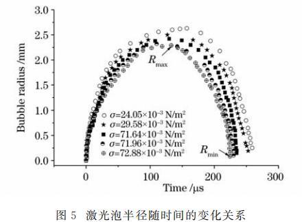 从图5可以看出,表面张力减缓了空泡的膨胀过程。在初期,空泡膨胀变缓的现象不甚明显,愈到后期越明显。液体张力越大,空泡对应的最大泡半径越小;表面张力加速了空泡的收缩。表面张力越大,空泡收缩所能达到的最小泡半径越小,且表面张力缩短了空泡脉动周期。从图5还可以看出表面张力对空泡溃灭的影响要强于对膨胀的影响。此外,激光泡半径随表面张力变化与液体的表面张力数值并不为线性关系,其关系有待研究。