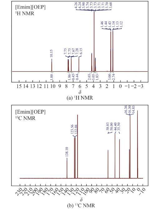 图1 1-乙基-3-甲基咪唑亚磷酸甲酯盐的核磁共振氢谱图和碳谱图