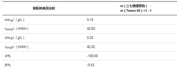 由前文实验结果可知,三七根提取物与Tween 60的cmc均为0.1 g/L。根据2.3.2中方法,确定了三七根提取物与Tween 60复配质量比为1∶1。在25℃下,复配体系理论值和表观值如表3所示。三七根提取物与Tween 60的复配体系形成胶束的能力减效100%,降低溶液表面张力的能力减效0.51%。结果表明,三七根提取物与Tween 60按1∶1质量比复配后,并不能对体系产生明显的协同增效作用,这可能与三七根提取物和Tween 60的含量、结构有关。