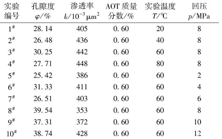 主要实验材料:选用2-(2-乙基己基)-磺酸琥珀酸钠(AOT)为表面活性剂;实验用CO2纯度为99.9%;实验用水为蒸馏水;实验岩心为填砂管模型,规格参数:600 mm×Φ25 mm。表1、2所给出的回压值即为岩心中流体所处的最低压力,只有高于该回压值,流体才可以流动。