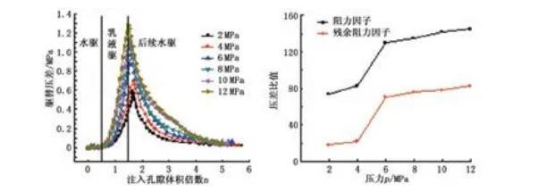 相比于高渗岩心,低渗岩心中由于毛管力较大,使得CO2乳液液滴与液膜之间的压差大,导致CO2乳液易发生破裂而形成气窜,减弱了CO2乳液的封堵性能,从而降低了流动阻力,同时乳液更倾向于进入高渗岩心,在岩心渗流过程中叠加的贾敏效应会使高渗岩心的渗流阻力不断增加,直至大于低渗岩心的渗流阻力,依据这一机制CO2乳液能够实现分流作用。