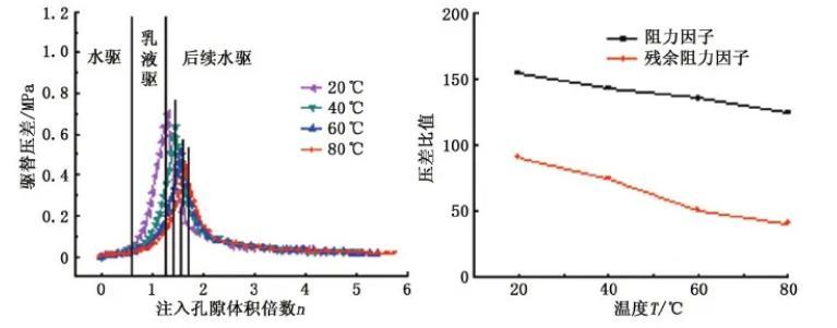 从图9可以看出,随着压力的升高,阻力因子和残余阻力因子均逐渐增强,说明形成的乳液性质大幅提高,之后随压力的升高增幅变小。这是由于随着压力的升高,CO2乳液界面黏弹性增加,乳液稳定性增强,乳液的强度及抗冲刷能力提高,且CO2密度也随着压力的升高而增大,因此乳液的表观黏度增加较为明显,从而提高了乳液的封堵能力。