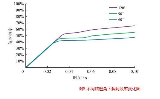 润湿反转剂能够改善孔隙表面润湿性和降低气水界面张力,且不同浓度的润湿反转剂作用后,孔隙表面的润湿角和气水界面张力会发生变化,影响解封过程中的流体微观分布和解封效率。建立润湿反转剂浓度分别为0、0.001 5%、0.003 0%和0.010 0%的模型,且不同润湿反转剂浓度下的界面张力和润湿角参数根据界面性质测试实验结果设置,研究不同浓度润湿反转剂对流体微观分布演化特征和解封效率的影响(图7)。从图中可以看出,随着润湿反转剂浓度从0增加到0.010 0%,气驱水波及范围和出口端见气时间均呈现先降低后增加的趋势,最终解封效率也呈现出逐渐降低的趋势,0.003 0%时与0.010 0%时接近,二者解封实验获得的解封压差也较为接近。由于随着润湿反转剂浓度的增加,孔隙壁面润湿性和气水界面张力同时变化,表明不同润湿反转剂浓度下呈现出的变化规律并非单调变化,因此分别设计了界面张力相同润湿角不同和润湿角相同界面张力不同的概念模型,厘清两个因素对解封特征参数的影响规律。