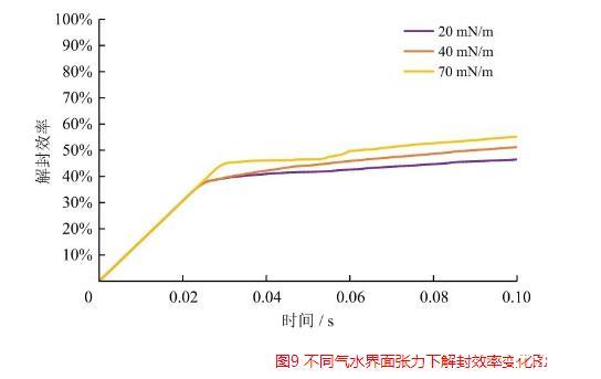 气水界面张力对注气解封过程及流体微观分布具有较大影响。建立70 mN/m、40 mN/m和20 mN/m等3种不同的气水界面张力的模型,分别代表润湿反转剂作用后的气水界面张力变化情况,研究不同气水界面张力条件下流体微观分布演化特征和解封效率差异性(图9)。从图中可以看出,随着气水界面张力的降低,毛细管力减小,大幅降低注气解封过程流体流动阻力,促进了气相优势通道的快速形成,说明气水界面张力的降低有助于减小解封压力,实现水封气藏的快速解封;但同时气水界面张力的降低,会导致气体微观波及效率降低,部分区域仍具有较高的含水饱和度,解封效率略微降低。因此,随着润湿反转剂浓度的增加,润湿反转剂能够降低气水界面张力,对解封过程产生明显的促进作用,但解封效率会略微降低。