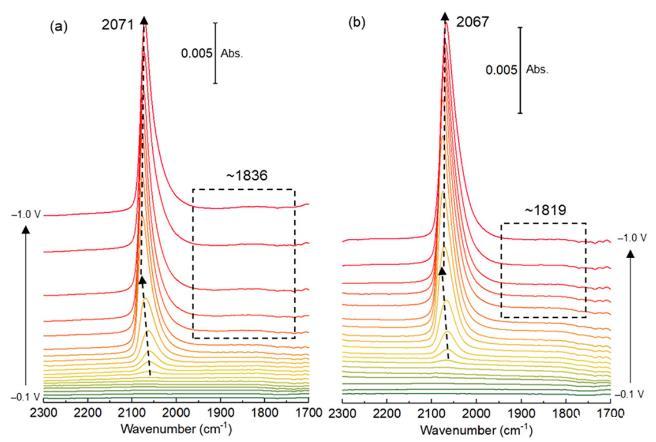 图1. 在CO2饱和的0.1 M KHCO3/H2O电解质中,(a)制备前铜薄膜和(b)阳极氧化铜薄膜在1700-2300 cm-1区域的原位SEIRAS光谱。0 V处的光谱用作背景。