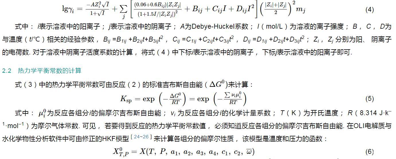 因此,式(3)中离子的活度系数可由OLI电解质与水化学物性分析软件[20]内嵌的Bromley-Zemaitis方程[22,23]来计算: