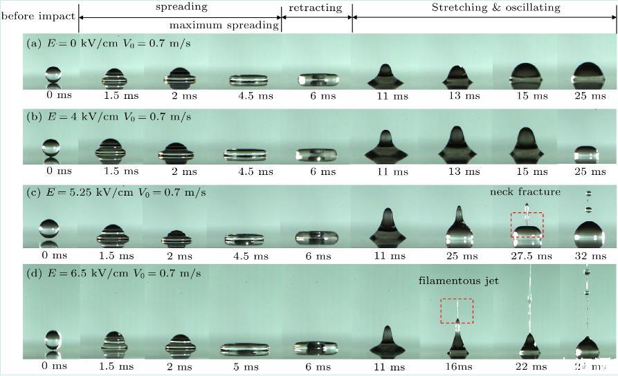 图2去离子水在不同场强下撞击亲水表面的模态变化图(We=17.8)
