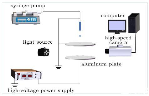 在本实验中,将两块直径为10cm的圆形铝板沿着垂直方向放置,其间隔固定为20mm。在上极板中心位置开一个直径为5mm的孔口,以便液滴从上极板上方滴落,穿过上极板与下极板发生撞击行为。为了实现垂直电场的形成,将高压直流电源与下极板相连,上极板作接地处理,这样的结构产生了一个垂直电场和一个带电的基底。此外,不锈钢针管(G24,外径0.55m,内径0.27mm)通过毛细管连接到微流注射泵上,使液滴以恒定的撞击速度滴落到下极板。为了消除静电对实验的影响,将针管作接地处理,确保液滴在进入电场之前不携带任何感应电荷。