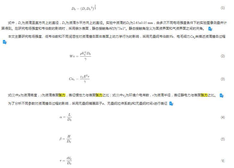 本文主要研究电场强度、低韦伯数和不同润湿性对液滴撞击固体表面上动力学行为的影响,采用无量纲韦伯数We、电毛细力Cae来描述液滴撞击过程