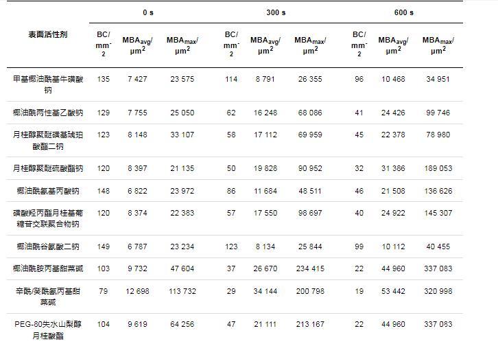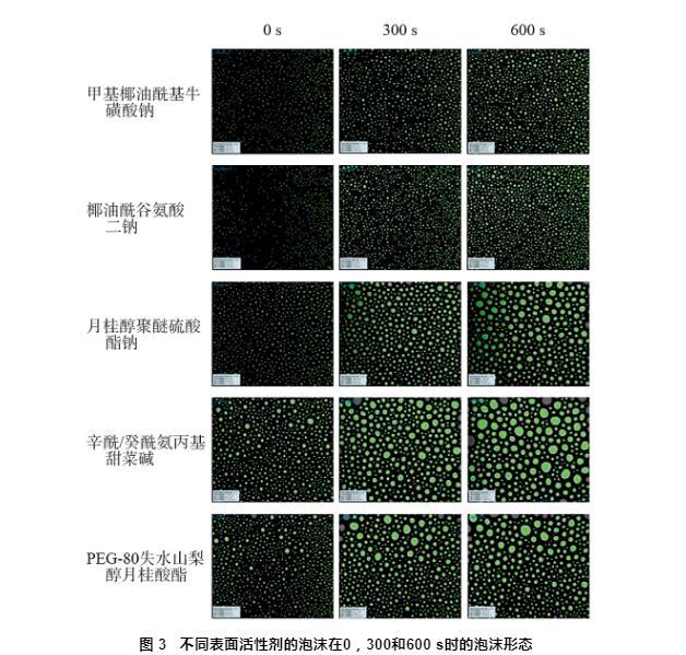 表3不同表面活性剂的泡沫在0,300和600 s时的气泡面积