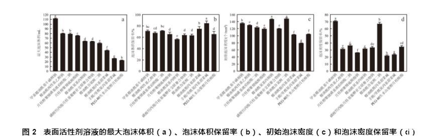 图2表面活性剂溶液的最大泡沫体积(a)、泡沫体积保留率(b)、初始泡沫密度(c)和泡沫密度保留率(d)