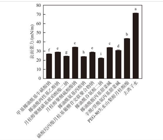 将10种表面活性剂的去离子水溶液(pH=6.0)进行表面张力测定,结果如图1所示。去离子水的表面张力为71.81 mN/m;所有表面活性剂均可显著降低去离子水的表面张力,其中PEG-80失水山梨醇月桂酸酯降低表面张力的能力最差,为43.73 mN/m;月桂醇聚醚硫酸酯钠和椰油酰胺丙基甜菜碱水溶液的表面张力无显著差异,分别为34.14和33.87 mN/m;辛酰/癸酰氨丙基甜菜碱水溶液的表面张力为30.54 mN/m;椰油酰两性基乙酸钠和磺酸羟丙酯月桂基葡糖苷交联聚合物钠水溶液的表面张力无显著差异,分别为28.88和28.71 mN/m;甲基椰油酰基牛磺酸钠水溶液的表面张力为26.74 mN/m;月桂醇聚醚磺基琥珀酸酯二钠水溶液的表面张力为24.16 mN/m;椰油酰氨基丙酸钠水溶液的表面张力较低,为23.84 mN/m;椰油酰谷氨酸二钠水溶液的表面张力最低,为22.08 mN/m。