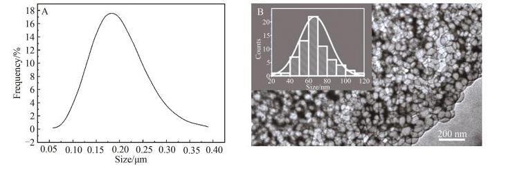图1硅丙乳液的粒径分布(A)和TEM图像(B)