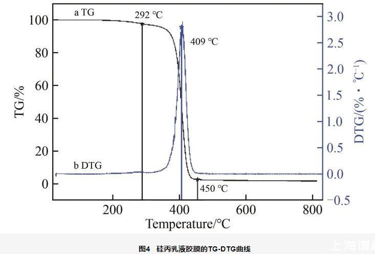 从图4可以看出,胶膜失重分为3个阶段:在292℃前,失重2.54%,此时失去的是胶膜中的水及小分子物质的挥发,胶膜并未发生分解;293~450℃之间为共聚物的热分解阶段,该范围失重95.30%,且分解速度较快,主要是Si—O、C—C、C—O和C—H键的断裂所致;450~800℃之间失重0.43%,这是共聚物分子链的断裂和分解,分解速度较为缓慢;800℃基本分解完全,仅剩下1.73%的灰分,证明硅丙乳液胶膜具有良好的耐热性。由DTG曲线可以看出,409℃热分解速率最大,说明硅丙乳液具有良好的热稳定性,这是因为在共聚物分子中引入了具有较高键能的Si—O—Si键的结果。