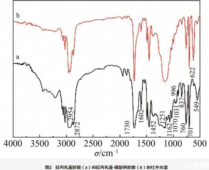 图2硅丙乳液胶膜(a)和硅丙乳液-硫酸钠胶膜(b)的红外光谱