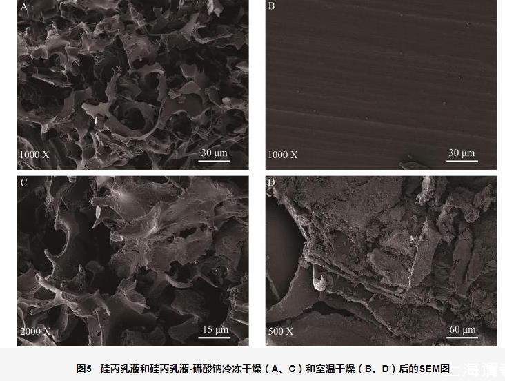 图5硅丙乳液和硅丙乳液-硫酸钠冷冻干燥(A、C)和室温干燥(B、D)后的SEM图